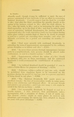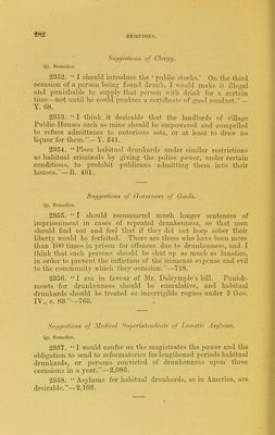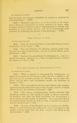 ![^84 KKMKTHK.S. Qy. lttuierli»*. aecorclmg tothoiimnbevnf irilialiitmits in onr-li pari.^li hv lofiinlntiTo onactment. —1). 22. 2807. In couutvy puvislies, ouc Pnlilie-HouHp for oOO people would be quite sufficient.—Ca. 23. 2868. {iive ns not more tlian one Pnlilic-Hous(( to evevv 1,000 people, and let tlieye l>e under stringeni rules, nnd inspcctrd by others than the police.—Ca. 56. 2869. Without interfering with vested interests, Public- Houses and Beer-Shops might be pro]iortioned to population; i.e., no fresh licence to he issued or forfeited one renewed where one (say) to 1,000 people already existed. This would gradually modify the evil, and be cnrdiallv supported bv the inhabitants,— M. 74. 2870. We need a very great reduction in the number of licensed houses, sav to one Public-House for every 1,000 people. R. 200. 2871. A law not permitting more than one house for the sale of intoxicating liquors to 1,000 people would doubtless he a great boon.—R. 889. Frow a M(t<ii!<tr(il<\ Qy. EeniedieH. 2872. ^\Tien the traffic cannot he entirely stopped, a minimum number of licences only should he granted ; say, one for each 1,000 inhahitants.-—2,8l'0. Frmii ihi' CluipJain 'if a Ciuo}. Qy. Remedies. 2378. I would suggest greater restrictions on the lioensuig of Public-Houses, especially as regards tiie pro])ortion to the population, and stricter inquiry into the character of landl'irds. 837. From Chief Con St nbli'-t <inil Stipennleiulents <ij' ]'oli,,'. Qy. Remedies. 2374. Reduce the number of Public-Houses and :i]qi(a-tion them in accordance with some definite rule based on population. 148.](https://iiif.wellcomecollection.org/image/b20404530_0306.jp2/full/800%2C/0/default.jpg)