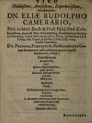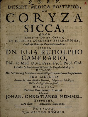 Dissert. medica posterior, de coryza sicca ... / praeside, Elia Rudolpho Camerario ... publico eruditorum examini subjiciet Johan. Christianus Hummel ... Anni 1689.