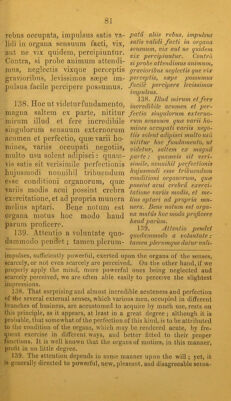 ![efScitur) ad animuni solum spec- tat, et liiiic propria est, sua oatura fugax et peritura, et simul simpli- cissima, nullisque aut defiuienda aut describenda verbis, rei externee quse sensum excitat disfeimillima, ab omui corporea conditione atque natura alienissima, ita ut neque ipsa, nec quicquam ipsi simile, in re externa quam percipimus iuesse possit. 131. Altera vero res quse vulgo subnomiuesensuscomprelieuditur, qualitas nimirum quse vis rei ex- ternse quam coutemplamur, qtiara seusus (mutatio scilicet in animi statu) nobis representat vel sug- gerit, longe diversse videtur esse naturae. Qualitates enim rerum externarura, quas sensus ope per- cipimus, ad illas res solas pertinent; neque anirao ullo pacto inesse pos- suut, nec quicquam cum animo, variisque ejus statibus, simile aut ficitur in statu animi) spec- tat ad anirnum solum, et est propria hide, fugax et peritura sud natura, et simul simplicissima, que aut definienda aut descri- benda nullis verbis, dissimil- Uma rei externce quee ex- citat sensum, alienissima ab Omni corporea conditione at- que natura, ita ut neque ipsa, nec qidcqtiam simile ipsi, possit inesse in externa re, quam percipimus. 131. Verb altera res quee vulgo comprehenditur sub nomine sensus nimirum quae- vis qualitas externce rei quam coutemplamur, quam sensus (scilicet mutatio in statu animi) representat vet suggerit nobis videtur esse longe diversce naturae. Enim qualitates externarum re- rum, quas percipimus ope sensus, pertinent ad illas res solas; neque possunt inesse animo ullo paclo, nec habent qidcquam simile aut commune cum animo state of the minr],) refers to the mind only, and is peculiar to this, fleeting and perishable in its nature, and at the same time most simple, and to be either defined or described by no terms, most unlike the ex- ternal object which excites sensation, very different from every cor- poreal state and nature, so that neither itself, nor anything like it, can exist in the external ol)ject, w'hich w'e perceive. 131. But the other thing which is commonly comprehended under the name of sensation, that is, any quality of an external object which we contemplate, w'hich the sensation (namely, the change in the state of mind,) represents or suggests to ns, appears to be of a very different nature. For the qualities of external things, which we perceive by the aid of sensation, relate to those thitigs alone, nor can exist in the mind in any degree, nor have thev anv thing alike or in common with the 7 §](https://iiif.wellcomecollection.org/image/b28149452_0085.jp2/full/800%2C/0/default.jpg)