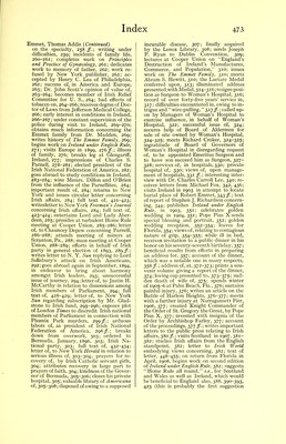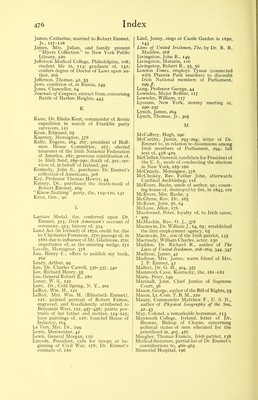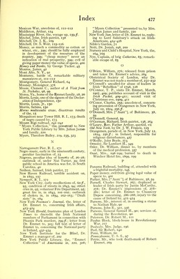 ![Mexican War, anecdotes of, 111-112 Middleton, Arthur, 124 Mississippi River, the, voyage up, 159 ff- Mitchel, John, Irish patriot, 138 Mitchell, Dr. J. K., 109 Mitchell, Dr. S. Weir, 115-116 Money, as much a commodity as cotton or wheat, etc., 399; should be fully employed in development of the resources of the country, 399; “cheap money” never an indication of real prosperity, 399; evil of giving paper money the value of specie, 400 Money and Banks, by George Tucker, 45 Monroe, James, 42 Mont Alto, N. Y., 91 Monterey, battle of, remarkable military manoeuvre at, 111-112 Montgomery, General Richard, 64 Mooney, Monsignor, 378 Moore, Clement C., author of A Visit from St. Nicholas, 98, 99 Morea, Va., home of the Emmet family, 18, 20 Morris, Louis, one of the signers of the Declar- ation of Independence, 150 Morris, Louis, Jr., 150 Morris, Sabina, 150 Mortis multicaulis craze, disastrous results of the, 15 Mosquitoes near Tower Hill, R. I., 173; death of negro caused by, 173 Mount Rigi railroad, 241-242 “Myers Collection,” the, presented to New York Public Library by Mrs. Julian James and family, 220 Myers, Theodore Bailey, 219, 235, 323 N Narragansett Pier, R. I., 171 Negro music, early in the nineteenth century, peculiar fascination of, 23 Negroes, peculiar idea of honesty of, 26-28; outbreak of, under Nat Turner, 39; first public school in America was for, in South Carolina, 40 Neilson, Samuel, Irish patriot, 77 New Haven Railroad, terrible accident on, in 1853, 157 Newport, R. I., 171 New York City, early recollections of, 60 ff., 93: condition of streets in 1843, 94; street cries in, 95: volunteer Fire Department, 95; great fire in, in 1843, 101-102; outbreak of cholera in, in 1854, 162-163: “Draft riots” in, 184 New York Freeman's Journal, the, letter of Dr. Emmet to, concerning Irish affairs, 423-424 New York Herald, frustrates plan of London Times to discredit the Irish National members of Parliament in connection with Phoenix Park murders, 299ff.\ letter from Dr. Emmet to, 303; full text of letter of Emmet to, concerning the National party in Ireland, 432-434 New York Institute for the Blind, Dr. Emmet a manager of, 202 New York Public Library, the, “Emmet Collection” of Americana in, 220, 308; “Myers Collection ” presented to, by Mrs. Julian James and family, 220 New York Sun, letter of Dr. Emmet to, reply- ing to Lord Salisbury’s attack on Irish- Americans, 424-428 Niblo’s Garden, 71 Nott, Dr. Josiah, 198, 200 Nursery and Child’s Hospital, New York, the, 164, 165 Nye, Captain, of brig Catherine, 85; remark- able escape of, 85 O O’Brien, William, 276; released from prison and takes Dr. Emmet’s advice, 284 Obstetrical Society of London, why Dr. Emmet was not made a memberof, 231-232 O’Connell’s uncalled-for abuse of leaders in Irish “Rebellion” of 1798, 128 O’Connor, T. P., visits Dr. Emmet, March, 1907, 409; publishes accoimt of visit in the Irish Packet, 409-411; second visit of Christmas eve, 1909, 411 O’Conor, Charles, 255; anecdote of, concern- ing procession of Orangemen in New York, July 12, 1824, 256 ff. O’Donnell, Mrs. [“Aunt”], of Baltimore, 58, 59 O’Donnell, General, 59 O’Gorman, Richard, Irish patriot, 138, 264 O’Leary, Rev. Father Arthur, quoted, vii Old New York, by Dr. J. W. Francis, 125 Orangemen, parade of, in New York, July 12, 1824, 256ff.; in Ireland, responsible for religious disturbances, 427 O’Reilly, John Boyle, 273 Ormsby, Sir Lambert H., 349 Osier, Dr. William, dinner to, by members of the medical profession, 357 Ouze, Mrs., 198-199: burned to death in Windsor Hotel fire, 1899, 199 P Panama Railroad, building of, attended with a frightful mortality, 145 Paper money, evil from giving legal value of specie to, 401 Parker, Mrs. [“Aunt”), of Baltimore, 58, 59 Parnell, Charles Stewart, 267; displaced as leader of Irish party by Justin McCarthy, 278; Dr. Emmet’s impressions of, 278- 281; letter of Dr. Emmet to Chauncey Depew concerning, 286-288; injury to the cause of Ireland by, 421-424 Parsons, Mr., interest of, in erecting a statue to Nathan Hale, 90 Parsons, John E., 321, 336 Parsons, General Samuel H., 90; services of, during the Revolution, 90 Paterson, Dr. Robert M., iii Paulus Hook, block-house in Revolutionary War, 217 Peabody, Mrs. Judge, 196 Peel, Sir Robert, 140 Penn, William, 60 Pennsylvania, U. S. S., 97 Petrie, Mr., who took death-mask of Robert Emmet, 269](https://iiif.wellcomecollection.org/image/b28034776_0623.jp2/full/800%2C/0/default.jpg)