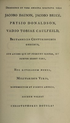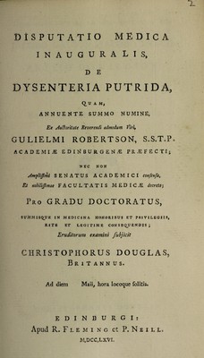 Disputatio medica inauguralis de dysenteria putrida. Quam ... ex auctoritate ... Gulielmi Robertson ... Academiæ edinburgenæ præfecti ... pro gradu doctoratus ... / eruditorum examini subjicit Christophorus Douglas, Britannus. Ad diem maii [1766].