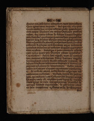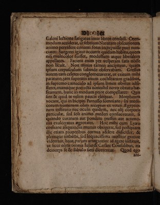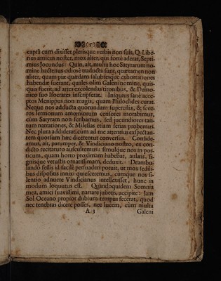 ![| 930089 P. «aptà cum dixiffet plerisque verbis rion fuis, Q. Libe- | rius amicus nofter, mox alter, qui forte aderat, Septi- * mius Jocundus: Quin, ait, multa hocSatyrarüm no- ! Ludi mine hactenus odiose traducta funt, quztamen non EE | aliter; quam ;piz quaedam falubtesque exhortationes 13 | habendz fuerant, qualescolim Galeai nomine, quis- i 1 quis fuerit;ad artes excolendas tironibus, Gc Demo- W a | nico fno Ifocrates infcripferat. .Iniquius fané accc- [ | - ptos Menippus non: magis, vm Philoclides:curat. | . Neque nos adducta quorundam fupercilia; & (cve- * Fk | ros fermonum amoeniorum cenfores morabimur, e | cüm Satyram non ícribamus, fed jucundiorces tan- 4 NR tum narrationes, & Milefias etiam ferias probemus. :] Nec plura addiderat; cum ad me attentius exfpectan- | tem quoríum hac dicerentur converfus. ^ Confide- f amus, ait, parumper, & Vindiciano noftro, ex con- | dicto recitaturo aufcultemus: fimuldue nos in pot- ticum; quam horto proximam habebat, aulzis, fi- LE nisiue vetuftis ornatiffimam, deduxit. : Deambu: | End feffis 1d facilé perfuadert potuit, ut mox fedili- bus difpofitis innixi quiefceremus,; càümque nos fi- Jlentio adnuere Vindicianus intellexiffec, hunc in modum loquutus eft. Quandoquidem Somnia mea, amici fuaviffimi, narrare jubetis, accipite :- Jam Sol Oceano propior dubium tempus fecerat; quod |00] nec tenebras dicere poíIes, nec lucem, cüm multa | | La n À.3 Galeni j33](https://iiif.wellcomecollection.org/image/b33083708_0013.jp2/full/800%2C/0/default.jpg)