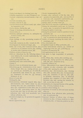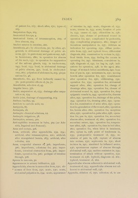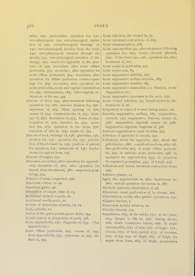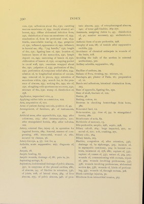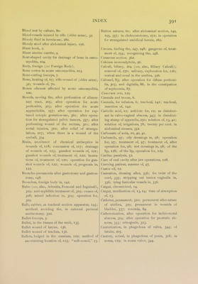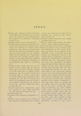 ![INDEX Abdomen, 190; collapsed, in asthenic acute peri- tonitis, 298; gau/.e packings in, 215; inodorous gas in, 196; inspection of, in Intussusception] 219; palpation of (j«y Palpation) ; penetrating wounds of, 190. Abdominal abscess, removal of packings, 259. Abdominal cavity, operations involving. 190; clos- ure with button sutures, 195; distention in peri- tonitis, 296; distention in ruptured ectopic gestation-sac, 358; distention in typhoid per- foration, 210; exploration, secondary, for vomit- ing, 206; hernia, locations of, 279; infection, diffuse, from the appendix, 231; injury, hema- temesis after, 196; packings, removal of, 259; palpation in acute appendicitis, 234; palpation in anaesthesia, 215; palpation in empyema of the gall-bladder, 265; rigidity in peritonitis, 296. ' Abdominal section, diuresis after, 206; for im- paction of pelvic tumors, 358; for injury to kidney, 339; for prolapse of intestine through rent in the rectum, 310; for ruptured ectopic gestation-sac, 359; for wounds of bladder itito peritoneum, 338; for wounds of ureter, 339; for wounds of uterus, 344; hemostasis in, 193; instruments for, 191; lines for incision, 193; method of, in penetrating wounds of abdomen, 193; persistent vomiting after, 205; prepara- tion for, 191; removal of sutures after, 205; the urine after, 206. Abdominal support, after cholecystotomy, 274; after operation for acute diffuse peritonitis, 305; after operation for appendicitis, 260. Abdominal suture, 195. Abdominal viscera, symptoms of strangulation of, 278. Abdominal wound, closing of, 149; closure of, after operation for appendicitis, 252; dressing 387 of, 195; open treatment of, in suppurative ap- pendicitis, 255; retraction of, 249; sutured, time of healing, 260. Abdominal wounds, enemata after, 196; washing out stomach after, 192. Ablation of appendix, 250; prepuce, 316; omen- tum, 281; tube in ruptured pyosalpinx, 353. Abortion, attempted, causing uterine wounds, 344. Abscess, 93; aspiration of, 94; drainage of, 95; from foreign body, 26; from infected hema- toma, 25; incision of, 94; treatment of, 94; abdominal, removal of packings from, 2159; alveolar, 127; appendicular, adherent to ab- dominal wall, 255; appendicular, in mesocolon, prognosis, 231; appendicular, not adherent to abdominal wall, 236; appendicular, rupture into rectum, 232; appendicular, spontaneous rupture through abdominal wall, 232; axillary, operation for, 185; cavity, digital exploration of, 138; cavity, hemorrhage from, 138; iliac, from appendicitis, operation for, 255; ischio- rectal, causes of, 311; ischio-rectal, diagnosis of, 311; ischio-rectal, causing interference w ith urination, 312; metastatic, 80, 82, 84; meta- static, from acute mastoiditis, 377; metastatic, in lateral sinus thrombosis, 382; metastatic, treatment of, 82; multiple, in suppurative or- chitis, 335; orbital, manner of opening, 368, 369; palmar, 160; pelvic, abdominal opera- tion for, 351; pelvic, curetting, 349; pelvic, danger of perforating, 349; pelvic, definition of, 347; pelvic, examination by rectum, 347; pelvic, operation through rectum, 350; pel- vic, operation through vagina, 348; pelvic, operation through vagina, danger of wound- ing ureter, 348; pelvic, operation through vagina, position of the patient, 348; peri- appendicular, evacuation of, 253; periton-](https://iiif.wellcomecollection.org/image/b21536351_0409.jp2/full/800%2C/0/default.jpg)