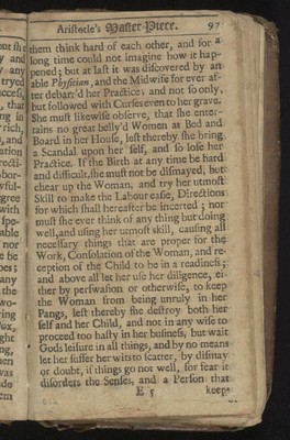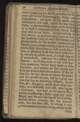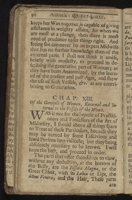 Aristotle's master-piece: or, The secrets of generation displayed in all the parts thereof. : Containing 1. The signs of barrenness. 2. The way of getting a boy or girl. 3. Of the likeness of children to parents. 4. Of the infusion of the soul into the infant. 5. Of monstrou births, and the reasons thereof. 6. Of the benefit of marriage to both sexes. 7. The prejudice of unequal matches. 8. The discovery of insufficiency. 9. The cause and cure of the green-sickness. 10. A discourse of virginity. 11. How a midwife ought to be qualified. 12. Directions and cautions to midwives. 13. Of the organs of generation in women 14. The fabrick of the womb. 15. The use and action of the genitals. 16. Signs of conception, and whether of a male or female. 17. To discover false conception. 18. Instructions for women with child. 19. For preventing miscarriage. 20. For women in child-bed. 21. Of ordering new-born infants, and many other very useful particulars. To which is added, a word of advice to both sexes in the act of copulation, and the pictures of several monstrous births. Very necessary for all midwives, nurses, and young-married women.