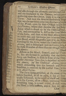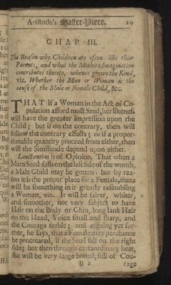Aristotle's master-piece: or, The secrets of generation displayed in all the parts thereof. : Containing 1. The signs of barrenness. 2. The way of getting a boy or girl. 3. Of the likeness of children to parents. 4. Of the infusion of the soul into the infant. 5. Of monstrou births, and the reasons thereof. 6. Of the benefit of marriage to both sexes. 7. The prejudice of unequal matches. 8. The discovery of insufficiency. 9. The cause and cure of the green-sickness. 10. A discourse of virginity. 11. How a midwife ought to be qualified. 12. Directions and cautions to midwives. 13. Of the organs of generation in women 14. The fabrick of the womb. 15. The use and action of the genitals. 16. Signs of conception, and whether of a male or female. 17. To discover false conception. 18. Instructions for women with child. 19. For preventing miscarriage. 20. For women in child-bed. 21. Of ordering new-born infants, and many other very useful particulars. To which is added, a word of advice to both sexes in the act of copulation, and the pictures of several monstrous births. Very necessary for all midwives, nurses, and young-married women.