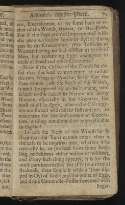 Credit: Aristotle's master-piece: or, The secrets of generation displayed in all the parts thereof. : Containing 1. The signs of barrenness. 2. The way of getting a boy or girl. 3. Of the likeness of children to parents. 4. Of the infusion of the soul into the infant. 5. Of monstrou births, and the reasons thereof. 6. Of the benefit of marriage to both sexes. 7. The prejudice of unequal matches. 8. The discovery of insufficiency. 9. The cause and cure of the green-sickness. 10. A discourse of virginity. 11. How a midwife ought to be qualified. 12. Directions and cautions to midwives. 13. Of the organs of generation in women 14. The fabrick of the womb. 15. The use and action of the genitals. 16. Signs of conception, and whether of a male or female. 17. To discover false conception. 18. Instructions for women with child. 19. For preventing miscarriage. 20. For women in child-bed. 21. Of ordering new-born infants, and many other very useful particulars. To which is added, a word of advice to both sexes in the act of copulation, and the pictures of several monstrous births. Very necessary for all midwives, nurses, and young-married women. Source: Wellcome Collection.