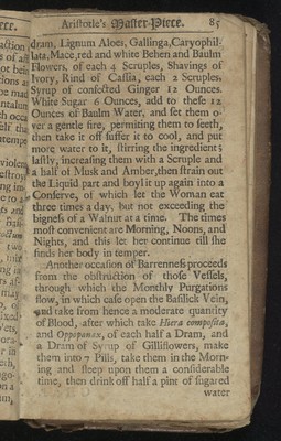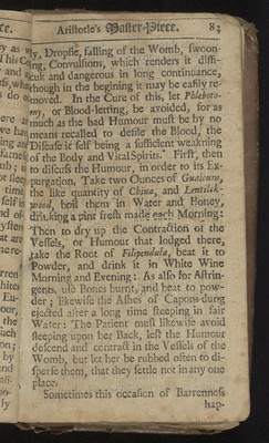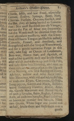 Aristotle's master-piece: or, The secrets of generation displayed in all the parts thereof. : Containing 1. The signs of barrenness. 2. The way of getting a boy or girl. 3. Of the likeness of children to parents. 4. Of the infusion of the soul into the infant. 5. Of monstrou births, and the reasons thereof. 6. Of the benefit of marriage to both sexes. 7. The prejudice of unequal matches. 8. The discovery of insufficiency. 9. The cause and cure of the green-sickness. 10. A discourse of virginity. 11. How a midwife ought to be qualified. 12. Directions and cautions to midwives. 13. Of the organs of generation in women 14. The fabrick of the womb. 15. The use and action of the genitals. 16. Signs of conception, and whether of a male or female. 17. To discover false conception. 18. Instructions for women with child. 19. For preventing miscarriage. 20. For women in child-bed. 21. Of ordering new-born infants, and many other very useful particulars. To which is added, a word of advice to both sexes in the act of copulation, and the pictures of several monstrous births. Very necessary for all midwives, nurses, and young-married women.