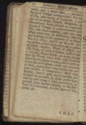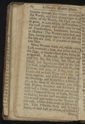 Credit: Aristotle's master-piece: or, The secrets of generation displayed in all the parts thereof. : Containing 1. The signs of barrenness. 2. The way of getting a boy or girl. 3. Of the likeness of children to parents. 4. Of the infusion of the soul into the infant. 5. Of monstrou births, and the reasons thereof. 6. Of the benefit of marriage to both sexes. 7. The prejudice of unequal matches. 8. The discovery of insufficiency. 9. The cause and cure of the green-sickness. 10. A discourse of virginity. 11. How a midwife ought to be qualified. 12. Directions and cautions to midwives. 13. Of the organs of generation in women 14. The fabrick of the womb. 15. The use and action of the genitals. 16. Signs of conception, and whether of a male or female. 17. To discover false conception. 18. Instructions for women with child. 19. For preventing miscarriage. 20. For women in child-bed. 21. Of ordering new-born infants, and many other very useful particulars. To which is added, a word of advice to both sexes in the act of copulation, and the pictures of several monstrous births. Very necessary for all midwives, nurses, and young-married women. Source: Wellcome Collection.