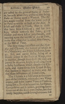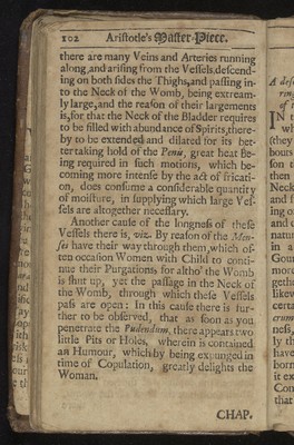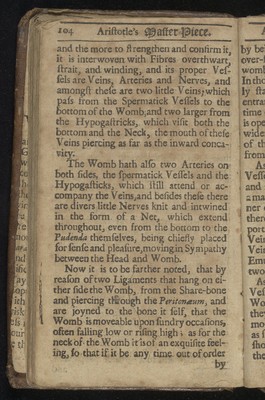 Credit: Aristotle's master-piece: or, The secrets of generation displayed in all the parts thereof. : Containing 1. The signs of barrenness. 2. The way of getting a boy or girl. 3. Of the likeness of children to parents. 4. Of the infusion of the soul into the infant. 5. Of monstrou births, and the reasons thereof. 6. Of the benefit of marriage to both sexes. 7. The prejudice of unequal matches. 8. The discovery of insufficiency. 9. The cause and cure of the green-sickness. 10. A discourse of virginity. 11. How a midwife ought to be qualified. 12. Directions and cautions to midwives. 13. Of the organs of generation in women 14. The fabrick of the womb. 15. The use and action of the genitals. 16. Signs of conception, and whether of a male or female. 17. To discover false conception. 18. Instructions for women with child. 19. For preventing miscarriage. 20. For women in child-bed. 21. Of ordering new-born infants, and many other very useful particulars. To which is added, a word of advice to both sexes in the act of copulation, and the pictures of several monstrous births. Very necessary for all midwives, nurses, and young-married women. Source: Wellcome Collection.
