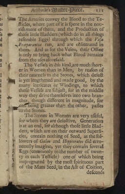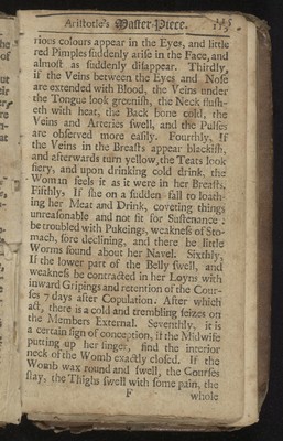 Aristotle's master-piece: or, The secrets of generation displayed in all the parts thereof. : Containing 1. The signs of barrenness. 2. The way of getting a boy or girl. 3. Of the likeness of children to parents. 4. Of the infusion of the soul into the infant. 5. Of monstrou births, and the reasons thereof. 6. Of the benefit of marriage to both sexes. 7. The prejudice of unequal matches. 8. The discovery of insufficiency. 9. The cause and cure of the green-sickness. 10. A discourse of virginity. 11. How a midwife ought to be qualified. 12. Directions and cautions to midwives. 13. Of the organs of generation in women 14. The fabrick of the womb. 15. The use and action of the genitals. 16. Signs of conception, and whether of a male or female. 17. To discover false conception. 18. Instructions for women with child. 19. For preventing miscarriage. 20. For women in child-bed. 21. Of ordering new-born infants, and many other very useful particulars. To which is added, a word of advice to both sexes in the act of copulation, and the pictures of several monstrous births. Very necessary for all midwives, nurses, and young-married women.