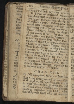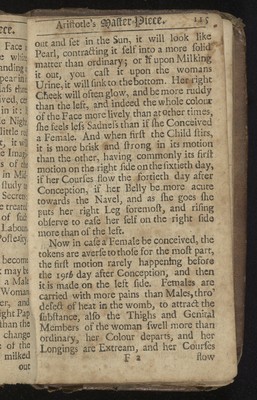 Credit: Aristotle's master-piece: or, The secrets of generation displayed in all the parts thereof. : Containing 1. The signs of barrenness. 2. The way of getting a boy or girl. 3. Of the likeness of children to parents. 4. Of the infusion of the soul into the infant. 5. Of monstrou births, and the reasons thereof. 6. Of the benefit of marriage to both sexes. 7. The prejudice of unequal matches. 8. The discovery of insufficiency. 9. The cause and cure of the green-sickness. 10. A discourse of virginity. 11. How a midwife ought to be qualified. 12. Directions and cautions to midwives. 13. Of the organs of generation in women 14. The fabrick of the womb. 15. The use and action of the genitals. 16. Signs of conception, and whether of a male or female. 17. To discover false conception. 18. Instructions for women with child. 19. For preventing miscarriage. 20. For women in child-bed. 21. Of ordering new-born infants, and many other very useful particulars. To which is added, a word of advice to both sexes in the act of copulation, and the pictures of several monstrous births. Very necessary for all midwives, nurses, and young-married women. Source: Wellcome Collection.
