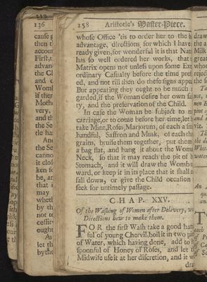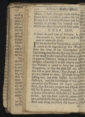 Aristotle's master-piece: or, The secrets of generation displayed in all the parts thereof. : Containing 1. The signs of barrenness. 2. The way of getting a boy or girl. 3. Of the likeness of children to parents. 4. Of the infusion of the soul into the infant. 5. Of monstrou births, and the reasons thereof. 6. Of the benefit of marriage to both sexes. 7. The prejudice of unequal matches. 8. The discovery of insufficiency. 9. The cause and cure of the green-sickness. 10. A discourse of virginity. 11. How a midwife ought to be qualified. 12. Directions and cautions to midwives. 13. Of the organs of generation in women 14. The fabrick of the womb. 15. The use and action of the genitals. 16. Signs of conception, and whether of a male or female. 17. To discover false conception. 18. Instructions for women with child. 19. For preventing miscarriage. 20. For women in child-bed. 21. Of ordering new-born infants, and many other very useful particulars. To which is added, a word of advice to both sexes in the act of copulation, and the pictures of several monstrous births. Very necessary for all midwives, nurses, and young-married women.