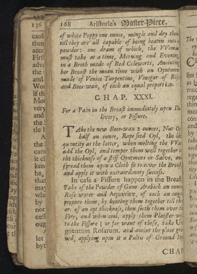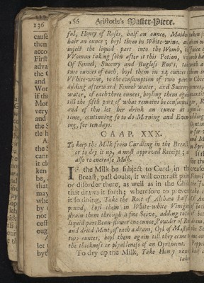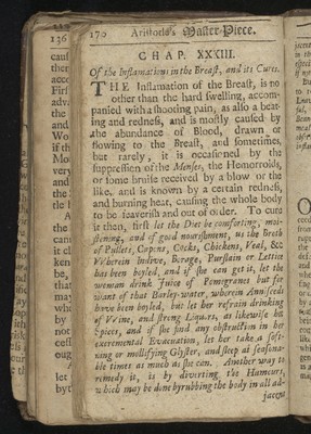 Aristotle's master-piece: or, The secrets of generation displayed in all the parts thereof. : Containing 1. The signs of barrenness. 2. The way of getting a boy or girl. 3. Of the likeness of children to parents. 4. Of the infusion of the soul into the infant. 5. Of monstrou births, and the reasons thereof. 6. Of the benefit of marriage to both sexes. 7. The prejudice of unequal matches. 8. The discovery of insufficiency. 9. The cause and cure of the green-sickness. 10. A discourse of virginity. 11. How a midwife ought to be qualified. 12. Directions and cautions to midwives. 13. Of the organs of generation in women 14. The fabrick of the womb. 15. The use and action of the genitals. 16. Signs of conception, and whether of a male or female. 17. To discover false conception. 18. Instructions for women with child. 19. For preventing miscarriage. 20. For women in child-bed. 21. Of ordering new-born infants, and many other very useful particulars. To which is added, a word of advice to both sexes in the act of copulation, and the pictures of several monstrous births. Very necessary for all midwives, nurses, and young-married women.