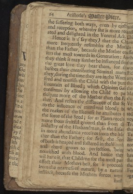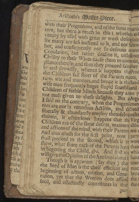 Credit: Aristotle's master-piece: or, The secrets of generation displayed in all the parts thereof. : Containing 1. The signs of barrenness. 2. The way of getting a boy or girl. 3. Of the likeness of children to parents. 4. Of the infusion of the soul into the infant. 5. Of monstrou births, and the reasons thereof. 6. Of the benefit of marriage to both sexes. 7. The prejudice of unequal matches. 8. The discovery of insufficiency. 9. The cause and cure of the green-sickness. 10. A discourse of virginity. 11. How a midwife ought to be qualified. 12. Directions and cautions to midwives. 13. Of the organs of generation in women 14. The fabrick of the womb. 15. The use and action of the genitals. 16. Signs of conception, and whether of a male or female. 17. To discover false conception. 18. Instructions for women with child. 19. For preventing miscarriage. 20. For women in child-bed. 21. Of ordering new-born infants, and many other very useful particulars. To which is added, a word of advice to both sexes in the act of copulation, and the pictures of several monstrous births. Very necessary for all midwives, nurses, and young-married women. Source: Wellcome Collection.