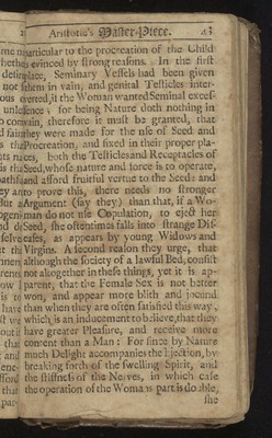 Aristotle's master-piece: or, The secrets of generation displayed in all the parts thereof. : Containing 1. The signs of barrenness. 2. The way of getting a boy or girl. 3. Of the likeness of children to parents. 4. Of the infusion of the soul into the infant. 5. Of monstrou births, and the reasons thereof. 6. Of the benefit of marriage to both sexes. 7. The prejudice of unequal matches. 8. The discovery of insufficiency. 9. The cause and cure of the green-sickness. 10. A discourse of virginity. 11. How a midwife ought to be qualified. 12. Directions and cautions to midwives. 13. Of the organs of generation in women 14. The fabrick of the womb. 15. The use and action of the genitals. 16. Signs of conception, and whether of a male or female. 17. To discover false conception. 18. Instructions for women with child. 19. For preventing miscarriage. 20. For women in child-bed. 21. Of ordering new-born infants, and many other very useful particulars. To which is added, a word of advice to both sexes in the act of copulation, and the pictures of several monstrous births. Very necessary for all midwives, nurses, and young-married women.