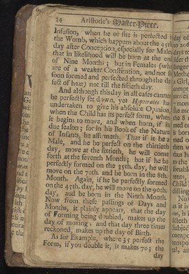 Credit: Aristotle's master-piece: or, The secrets of generation displayed in all the parts thereof. : Containing 1. The signs of barrenness. 2. The way of getting a boy or girl. 3. Of the likeness of children to parents. 4. Of the infusion of the soul into the infant. 5. Of monstrou births, and the reasons thereof. 6. Of the benefit of marriage to both sexes. 7. The prejudice of unequal matches. 8. The discovery of insufficiency. 9. The cause and cure of the green-sickness. 10. A discourse of virginity. 11. How a midwife ought to be qualified. 12. Directions and cautions to midwives. 13. Of the organs of generation in women 14. The fabrick of the womb. 15. The use and action of the genitals. 16. Signs of conception, and whether of a male or female. 17. To discover false conception. 18. Instructions for women with child. 19. For preventing miscarriage. 20. For women in child-bed. 21. Of ordering new-born infants, and many other very useful particulars. To which is added, a word of advice to both sexes in the act of copulation, and the pictures of several monstrous births. Very necessary for all midwives, nurses, and young-married women. Source: Wellcome Collection.