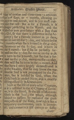 Aristotle's master-piece: or, The secrets of generation displayed in all the parts thereof. : Containing 1. The signs of barrenness. 2. The way of getting a boy or girl. 3. Of the likeness of children to parents. 4. Of the infusion of the soul into the infant. 5. Of monstrou births, and the reasons thereof. 6. Of the benefit of marriage to both sexes. 7. The prejudice of unequal matches. 8. The discovery of insufficiency. 9. The cause and cure of the green-sickness. 10. A discourse of virginity. 11. How a midwife ought to be qualified. 12. Directions and cautions to midwives. 13. Of the organs of generation in women 14. The fabrick of the womb. 15. The use and action of the genitals. 16. Signs of conception, and whether of a male or female. 17. To discover false conception. 18. Instructions for women with child. 19. For preventing miscarriage. 20. For women in child-bed. 21. Of ordering new-born infants, and many other very useful particulars. To which is added, a word of advice to both sexes in the act of copulation, and the pictures of several monstrous births. Very necessary for all midwives, nurses, and young-married women.