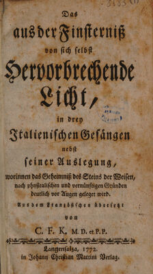 Das aus der Finsterniss von sich selbst hervorbrechende Licht, in drey italienischen Gesängen nebst seiner Auslegung, worinnen das Geheimniss des Steins der Weisen, nach physikalischen und vernünftigen Gründen deutlich vor Augen geleget wird / Aus dem Französischen übersetzt von C[hristian] F[riedrich] K[eller] M.D. et P.P.