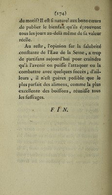 Dissertation sur la nature des eaux de la Seine, avec quelques observations relatives aux propriétés physiques et économiques de l'eau en général / [Antoine Augustin Parmentier].