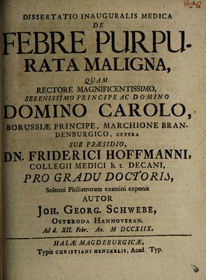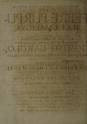 Credit: Dissertatio inauguralis medica de febre purpurata maligna ... / [Johann Georg Schwebe]. Source: Wellcome Collection.