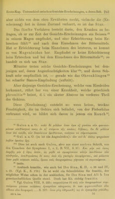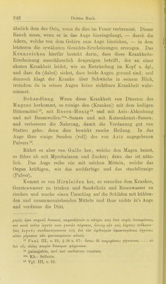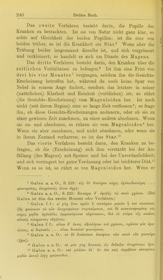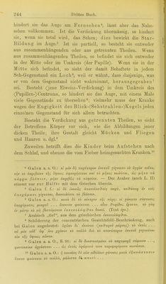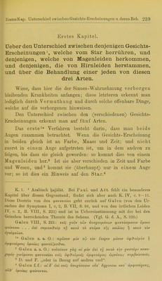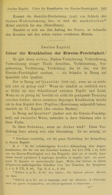 ![bindert sie das Auge am Fernsehen4, lässt aber das Nahe- sehen vollkommen. Ist die Verdickung übermässig, so bindert sie, wenn sie total wird, das Sehen; dies bewirkt die Star- Bildung im Auge.5 Ist sie partiell, so besteht sie entweder aus zusammenhängenden oder aus getrennten Theilen. Wenn aus zusammenhängenden Theilen, so befindet sie sich entweder in der Mitte oder im Umkreis (der Pupille). Wenn sie in der Mitte sich befindet, so sieht der damit Behaftete in jedem Seh-Gegenstand ein Loch6, weil er wähnt, dass dasjenige, was er von dem Gegenstand nicht wahrnimmt, herausgegraben7 sei. Besteht (jene Eiweiss-Verdickung) in dem Umkreis des (Pupillen-)Centrums, so hindert sie das Auge, mit einem Male viele Gegenstände zu übersehen8; vielmehr muss der Kranke wegen der Engigkeit des Blick-(Sehstrahlen-)Kegels jeden einzelnen Gegenstand für sich allein betrachten. Besteht die Verdickung aus getrennten Theilen, so sieht der Betroffene Körper vor sich, wie die Abbildungen jener dicken Theile; ihre Gestalt gleicht Mücken und Fliegen und Haaren u. dgl.9 Zuweilen betrifft dies die Kinder beim Aufstehen nach dem Schlaf, und ebenso die vom Fieber heimgesuchten Kranken.10 4 Galen a. a. 0.: et fiev ö!/ nayvzeQOV envzov ylyvouo zb vygbv zovzo, zfjv ze axQißeiav zrjg byjecog acpon,qr]aezai xai zb ftrjxog xwlvaei, oig (irjze za. nöqqa) ßleneiv, fir)ze äxqißüg za nlrjaLov. — Der Araber (auch L. DI) stimmt nur zur Hälfte mit dem Griechen überein. 5 Galen f. f.: ei de ixavwg unozelea&eLr) nayv, xafräneQ iv zoic vnOjfViLaoi ylfvezai, Suxxcohuaei zb ßlenetv. 6 Galen a. a. 0.: xaza Öe zb xevzqov zrjg xöqtig et fivoizo avazaai; vno/v^azog /jixqov . . . anavza cpaivezat . . . olov xfvqiÖag fyovvx. to yäq ev /j.eaa zb fir/ ßlenö^ievov exxexolätpd-ai doxet. (Text e'yx.) 7 Arabisch „tief, aus dem griechischen ixxexol&cp&ai. 8 Schilderung der concentrischen Gesichtsfeld-Beschränkung, auch bei Galen angedeutet: bquiai dt exebov (xattaqov jxeqovgy za t'xzbg . . . ov uev o&8' vcp' eva xqovov za nollä öiä zb azepuzeqov tavzov yeyovivnt zbv zrjg bipeag xüvov. 9 Galen a. a. 0., S. 96: ec äe öiaanaa^teva in na/vfieqij aüpaza . . ., tpavznoiav egyäaezai . . . üg e'xzbg öqüp.efü ziva neQiqpeQÖ(ie>>a xwvümut. 10 Galen a. a. 0.: ') zoiavii] öe zwu slSäXav yeVeo-ic [teza e'Suväuzaaiv vnvov rpaü'ezai zit nolla, [iühaza öi nauri ...](https://iiif.wellcomecollection.org/image/b21286693_0288.jp2/full/800%2C/0/default.jpg)