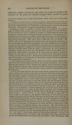 ![Another observation occurs, viz., that the whole of the limb below the ligature, where the crural artery had been taken up, must have been entirely supplied with such altered blood ; and as it kept its life, its warmth, and the action of its muscles, it is evident that the colour of the blood is of little service to any of those properties. It is pro- bably from this cause that granulations on the lower part of the lower extremity look dark when the person stands erect, as well as in very indolent sores, however situated. Another observation strongly in favour of the supposition that rest is a cause of the change of blood from the scarlet colour to the dark or modena, is taken from the common operation of bleeding; for we generally find the blood of a dark colour at its first coming out, but it becomes lighter and lighter towards the last. Some reasons may be given for this: first, it has stagnated in the veins while the vein was filling, and the orifice making, which occupy some lime, and may render it darker than it otherwise might have been in the same vein; secondly, when there is a free orifice the blood may pass more readily into the veins from the arteries, and therefore may be somewhat in the state of arterial blood, which may occasion the last blood to be rather lighter. What amounts almost to a proof of this is, that although a ligature is tied so as to stop the passage of the blood to the heart, and therefore it might be supposed not to have so free a passage from the arteries as in com- iii)ii, yet, from the following observations, it appears that it cer- tainly has a much freer; for if the orifice be large in a full-sized vein, the arm beyond the orifice will be much paler than the natural colour, and the blood will become more florid; but if, on the con- trary, the vein be small, and little blood passes, it will retain its dark colour; this, however, would appear not always to be the case. I bled a lady, whose blood at first was of a dark colour; but she fainted, and while she continued in the fit the colour of the blood that came from the vein was a fine scarlet. The circulation was then very languid. We may observe that venal blood in the most healthy is com- monly, if not always, the darkest; and that whenever the body is the least out of order, it is then not so much changed from the florid to the very dark purple. This I have often observed, and particu- larly recollect a striking instance of it in a gentleman who had a florid throughout the whole system of those animals which perished from cold {Dr. 1Jodgkin's Notes to Edwards*) ; whereas, under the influence of moderate warmth, such as that of the body, these changes take place, slowly on extravasated or stagnating' blood, but instantly in the extreme capillaries. It will be sufficient to have noticed in this place the analogy which subsists be- tween the venalization of the blood under these different circumstances, without pretending to decide whether these phenomena depend on the gradual union of carbon and oxygen with each other, or on any other cause.. The subject will be resumed in a future note.] » Se^ I'll wards on Physical Agents, &c, published in the Select Medical Library for 1838. 9](https://iiif.wellcomecollection.org/image/b21131466_0097.jp2/full/800%2C/0/default.jpg)