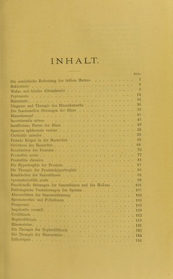 ![INHALT. Seite Die semiotische Bedeutung des trüben Haines 1 Bakteriurie Wahre und falsche Albuminurie ^ Peptonurie ■ Hämaturie Diagnose und Therapie des Blasenkatarrhs 26 Die functionellen Störungen der Blase 39 Blasenkrampf Incontinentia urinae i • lusufficienz; Parese der Blase 'i9 Spasmus spbincteris vesicae S6 Urethritis anterior 59 Fremde Körper in der Harnröhre 65 Stricturen der Harnrühre 68 Krankheiten der Prostata 75 Prostatitis acuta 77 Prostatitis chronica 81 Die Hypertrophie der Prostata 87 Die Therapie der Prostatahypertrophie . . 90 Krankheiten der Samenblasen 95 Spermatocystitis acuta 98 Functionelle Störungen der Samenblasen und des Hodens 101 Pathologische Veränderungen des Sperma 101 Abnormitäten der Samenentleerung 105 Spermatorrhöe und Pollutionen 105 Prospeimic . 105 Impotentia coeundi 109 Urolithiasis 113 Nephrolithiasis 118 Blasensteine 121 Die Therapie der Nephrolithiasis 123 Die Therapie der Blasensteine 124 Lithotripsie ]2(5](https://iiif.wellcomecollection.org/image/b21995643_0011.jp2/full/800%2C/0/default.jpg)