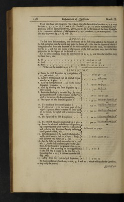 ![From the three laft Equations tis evident, that the three defired numbers a, y may be either 9, 15 , or gf-, 8|-, and 13^ : For firft, 5, 9, 13 are in Arithmetical Pro- greffion; and if 5 be multiplied by 1, 9 by 2, and 13 by 3 ^ the fumra of the three Produds is 62 . moreoveri the fumm of the Squares of 9,13 makes 2 75;j as was required. The like may be prov^ by 3 f-, 8and 13 J^BST. zo. To find three fuch numbers, that the Square of the firft being added to the Product of the firft multiplied into the fecond may make the fumm 48; alfo, that the Square of the firft being fubtrafted from the Product of the firft multiplied into the third, the Remainder may be 3 2 ^ and that the fumm of the Squares of the firft and third may have the fame proportion to the Square of the fccofid as 5 to 2. Let the three numbers fought be reprefented by 4 j e, 7, and then thcQueftion may be ftated thus, ' I. If . i . : : : . V . : ; 1. And . .. 3* Aiud • . • .(•' What arc the numbers 4, e, 7 ? RESO LVTIO N. 4^ From the firft Equation by tranfpofition ofj y this arifeih, . 5* And by dividing each part of the laft Equa-i tion by it gives . . .. 6. And by tranfpofition of — aa in the fecond? Equation , it makes.' • o 7. And by dividing the fixth Equation by , > there arifeth . ...0 8. From the Analogy in the third ftep, by com¬ paring the Produd of the extremes to the Pro-, dud of the means, this Equation arifeth, 9. The Square of the feventh Equation is . . )> » _ • At rrr 48 ;• . ay — aa z=z 2^ • ce 5 , l at — ^8-~^aa ,-Al aa ay — aar\* 2^ ^ aa -1— 2 2 ; =-!- a ^ee ■=. iaa-\-^2yy jy rr: 6^aa-\-a‘^ 10. The double of the ninth Equation is . ^ J> 11. If inftead of lyy in the latter part of the eighth Equation there be taken the latter part( of the tenth, the eighth will be converted into( this, 'vvzjt . ...... 12. The Square of the fifth Equation is . . .9 . / 13. The twelfth Equation multiplied by 5 gives {>.1. 14. From the eleventh and thirteenth Equations, by comparing their latter parts one to the other,' and reducing the Equation thereby refulting, this Equation arifeih, viz,. 3 5. Which Equation in the ftep being refol- ved by the Canon in SeU.io. Chap.i j. £00^1. will difeover two values of a, viz, . . . 3 5. But the leffer of thofe two values of a, to^ wit, 4, is the firft number fought by the Que- ftion, for the Square of the greater value exceeds 48 , but according to the fuppofition 9 in the firft ftep it ought to be Icfs than 48 • ] 1 fuppofing then ^ = 4, it follows from the fifth 11 ftep, that.. . J 37. Laftly, from the 1 •^th and yth Equations, 9 So three numbers are found out, to wit, 4, 8 and as may ealily be proved. V) ^ee _ 'i-oa8-\^\2 8aaJ^7af^ aa _ 2 04 8 12 8aa-\^^a'^ aa ee _ 2304 — g6aa a* aa. ^ee 115-20—48 aa 6o8aa—a'^— 9472 4 = \^S9z or 4 c = 8 12 7—12 which will fatisfie the Queftion,](https://iiif.wellcomecollection.org/image/b30333726_0001_0318.jp2/full/800%2C/0/default.jpg)