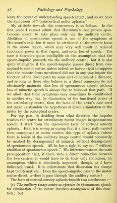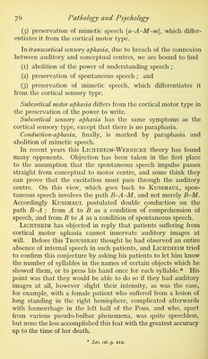 ![cortical motor aphasia, when it is in the articulatory centre ; subcortical sensory aphasia, when there is interruption of the centripetal path to the auditory centre ; subcortical motor aphasia, when there is interruption of the centrifugal path from the articulatory centre ; transcortical motor aphasia, when there is lesion of the path between conceptual and articulatory centres ; transcortical sensory aphasia, when there is lesion of the path between auditory and conceptual centres ; and conduction-aphasia, as I have said, when the path between auditory and articulatory centres is interrupted. I will now give you the symptoms characteristic of these different types. Cortical motor aphasia is marked by (1) abolition of spontaneous speech, which requires an intact path from conceptual centre to periphery by way of the motor centre [B-M-m] ; (2) abolition of mimetic speech, which requires the path a-A-M-m ; (3) preservation of the power of understanding speech [a-A-B]; and according to these writers (4) abolition of the power of writing, or Agraphia; but I postpone the treatment of derangements of writing and reading. In cortical sensory aphasia, from lesion of the auditory centre, there is (1) abolition of the power of understanding speech, which needs the path a-A-B, and obviously also (2) abolition of mimetic speech ; (3) preservation of spontaneous speech, which is held to take place along the path B-M-m. But observation shows that though spontaneous speech is not abolished in cases of this kind, paraphasia, or substitution of wrong words, occurs, a phenomenon whose causes we shall have to discuss by and by in some detail. Transcortical motor aphasia, resulting from interruption of the path from B to M, is marked by (1) abolition of spontaneous speech, as is evident from what has been said ; (2) preservation of the power of understanding speech [a-A-B]; and](https://iiif.wellcomecollection.org/image/b28081237_0091.jp2/full/800%2C/0/default.jpg)