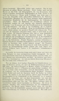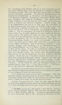 ![diese Anschauung doch bedenken, daß sie in ihren Lazaretten ein sehr ausgesiebtes Material hatte, denn die schwersten ^Verletzungen ließen sie den Japanern zurück. Diese aber sahen sich bald genötigt, hei Schädel- schüssen energischer vorzugehen. Sie haben die Tangentialschüsse und komplizierten Schädelbrüche in den Kriegs- und Reservelazaretten, wie in Friedenszeiten behandelt: Erweiterung verunreinigter Wunden, Reini- gung, Extraktion aller faßbaren Fremdkörper. Das scheint mir das richtige Verfahren zu sein und nicht das laisser aller! Auch Oettingen spricht zu Gunsten eines aktiveren Vorgehens. Guß eff beklagt, daß er die Schädelschüsse erst vom 4.—8. Tage nach der Verwundung in die Hand bekommen habe und beweist an 18 Fällen, daß an üjnen niclit die Trepanation rechtzeitig verrichtet war. Sie wai'en alle infiziert, l^is starben von ihnen 8. Von 8 AVerwundeten mit ausgebildetem Hirnabszeß starben 4. A^on 10 Verwundeten, bei denen kein lokalisierter Herd be- stand, sondern nur eine äußere Infektion der stai’k zersplitterten KnocJien, starben auch 4. Die anderen 10 blieben am Leben. Es stehe fest, daß ein großer Teil der Gehirnschüsse operiert Averden müsse. Darum Aväre es besser die Infektion, die, wie die Gehirnabszesse, nicht imme]- von Temperaturerhöhung begleitet sei, nicht erst abzinvarten. Tangential- schüsse, bei denen nur die äußere Tafel eingediLckt sei, geliörten doch zu den größten Seltenheiten. Auch Dergushinski berichtet 8 ausge- zeichnete Resultate nach Extraktion von 2 A^ollmantelgeschossen und einer Shrapnellfüllkugel, die in 2 Fällen 5 Alonate, in einem 0 Alonate im Hirn gesteckt hatten. Sie saßen in oberllächlichen Gehirnteilen und waren leicht zu extrahieren. Man soll dabei nach den Projektilen nicht lange und verletzend suchen. Sie müssen (Inrch Roentgenbestrahlung nachgCAviesen sein und ihre Entfernung darf kein Avichtiges Gehirnfeld verletzen. Heule hat zAA^ar 5 Projektile einheilen lassen und nur ein Stück eines zersprengten Shrapnells entfernt. Damit ist aber noch nicht bcAviesen, daß sich diese Fremdkörper ruhig verhalten Averden. Je später man beim Gehirnabszesse operativ eingreift, desto aussichtsloser ist das Averfahren. A^on der Gefahr der rohen und frühzeitigen Transporte der Schädelverletzten haben uns v. Zoege-AIanteuffel, v. Oettingen, Lloorn und andere die schlimmsten Erfahrungen mitgeteilt. Zum Schlüsse noch eine Beobachtung, die Matthiolius mitteilt: Ein nach einer Kopfverletzung mit Kugelretention geheilter Patient, der noch aphasisch war, stolperte bei einem Ausgange und konnte bald darauf sprechen. Cholin erwähnt einen Schuß durch die rechte Schläfengegend. Sofort traten linksseitige Lähmung, Pulsverlangsamung und epileptische Anfälle ein. Nach Er- w^eiterung der Knochenwunde konnte der Patient geheilt nach 3 Wochen evakuiert werden. Es fragt sich wie lange? Nur die linke Hand blieb schwach. Anhang: Kriegspsych osen i). Durch den Krieg steigt die Zahl der Psychosen bei den Soldaten, besonders aber bei den Offizieren beträchtlich und zwar mit der Dauer des Krieges und noch über diesen hinaus (Stier). Oserezkowski 1) Literatur: Awtokratow, Allg. Zeitschr. f. Psych. Bd. 64. — Borisch- polki, Deutsche militärärztl. Zeitschr. 1904, auch Russ. med. Rundsch. 1906. 50. Bd. 8, Militär. Wochenbl. 1906. 40. — Evakuation geisteskranker Soldaten etc. Russ. med. Rundsch. 1906. S. 748. — Honigmann, Monatsschr. für Psych.](https://iiif.wellcomecollection.org/image/b28986556_0120.jp2/full/800%2C/0/default.jpg)