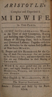 Aristotle's compleat and experienc'd midwife in two parts : I. Guide for childbearing women ... together with suitable remedies for the various indispositions of new-born infants. II. Proper and safe remedies for the curing all those distempers that are incident to the female sex ... a work ... highly necessary for all surgeons, midwives, nurses, and child-bearing women / made English by W[illiam] S[almon], M.D.