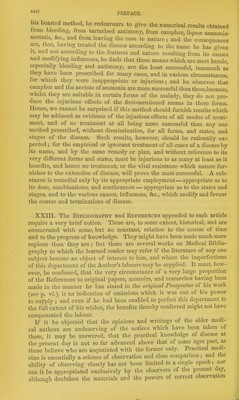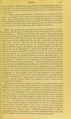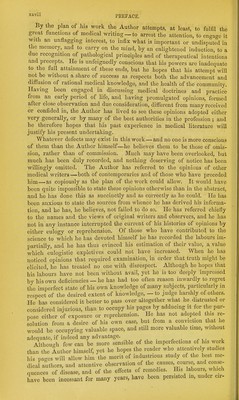 ![CLASSIFIED CONTENTS. Preliminary Remarks.—An Arranged Contents of his work is attempted by the Author with the object of enabling the student of medicine, and the medical practitioner, to peruse what he has advanced as the results of his observation—of his practical experience—and of his reading, with the most advantage, and in the most suggestive manner. Information is useful not only as respects its amount, but also as regards what it may suggest to the mind of the reader calculated to lead to further investigation and illustration, than the limits allotted by the Author to the many subjects and topics which have come under his consideration could allow. He has endeavoured to arrange these subjects, both pathological and practical, in such an order as may enable the information first afforded, or successively obtained, to contribute to the elucidation, and to the more complete comprehension, it is hoped, of what is subse- quently discussed. It may be necessary to premise that the Classification of diseases here attempted is, as far as the Author is concerned, altogether original, although it was first published in the London 3Iedical Repository, in 1822. Notwithstanding that this attempt was made at so early a period of his practice, he had then enjoyed extensive opportunities of observation in this country, on the continent of Europe, and within the tropics. This classification and the pathological principles here stated are the same as were then published. Comprehensive and close observations, the sources of true experience, which he believes himself to have possessed, as well as to have exerted, have confirmed him in the belief, that his arrangement is the most useful, practically or therapeutically, inasmuch as it is founded upon, and has constant reference to, the conditions of vital force—to that power which actuates the whole human organisation, and to which a continued regard must necessarily be had, and a constant reliance placed, in our efforts to alleviate or to remove disease. During the many years, in which the Author was en- gaged in lecturing on the Principles of Pathology and on Practical Medicine, he adopted this classi- fication, and he believes that it was then conducive to the acquisition of practical knowledge by Ins PUThis arrangement being thus based upon the states of vital force and upon the unquestionable facts, that disease, especially in its slightest and earliest deviations from health, is a deranged manifestation of life in some tissue, organ, or system; that this deviation is followed by a succession of changes, until alterations of the fluids, secretions, and structures supervene; that the existing change has been in- duced by that which preceded it, often aided by.the persistence of the exciting cause or causes and bj« the concurrence of additional influences; and that it will itself occasion still further changes, if not arrested by science or art, or by the efforts of nature, or, in other words by the resistance(which the vital force or power may be enabled to oppose to successive or unfavourable changes.-it follows that a due r cognition of the simplest and earliest manifestations of disorder, a correct estimate of existing changes, and an accurate view of future contingent alterations and results are of the utmost importance nTmerely as respects the places assigned to them in the classification, but still more as regard the adoption of indications of alleviation or of cure, and the selection of means by which these indications mStlfuffiSS Of the essence of life itself we know nothing further, than that it is associated wi h, 211 ^ed bystrncture, the simplest and lowest structures ^^^t£^S£SA generally diffused functions or properties, the more complex organisations h gher manifestations, fhe highest and most perfect of created beings alone possessing its h.ghest forties. Theglowest formations which evince vitality possess organic nervous.<«pus £^£^3 circulating systems; and as we ascend the scale of animal creation, th oigam nonous fl^*] from rudimcntal, through more perfect developments, to the ^^^^£^1^ in the highest order of animal, Over the two latter J^^J^SSSS * SLfto the organically sensitive presides; each of theaere*£OCal? aidtog«J™JH itself m,serves the others, and thereby supporting and increasing the vital forte, WJUifll vuis](https://iiif.wellcomecollection.org/image/b20416143_001_0036.jp2/full/800%2C/0/default.jpg)