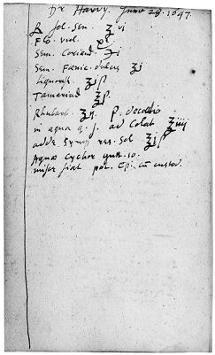Credit: M0016127: Prescription recorded by William Harvey (1578-1657). Source: Wellcome Collection.