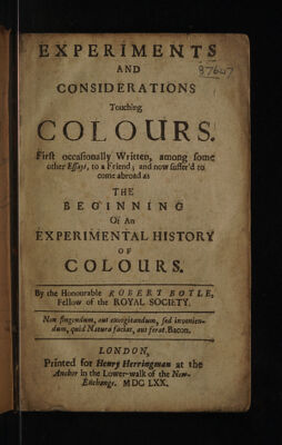 Experiments and considerations touching colours. First occasionally written among some other essays, to a friend; and now suffer'd to come abroad as the beginning of an experimental history of colours / By the Honourable Robert Boyle.