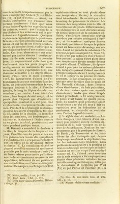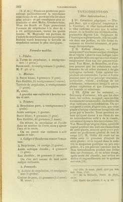 ![(N. d. tr.) [ Plusieurs praticiens pres- crivent préférablement la strychnine sous forme de sel, parce qu’elle est alors plus soluble et par conséquent plus as- similable et sîlre. Malin, Grocbenehùtz, Won der Busch et Fayc prescrivent l’azotate de strychnine à la dose de 5 à 10 milligrammes, toutes les quatre heures. M. Magendie est partisan de l’ioda te de strychnine dans les paralysies. Ricliini vante beaucoup le tartrate de strychnine comme le plus énergique. Formules modèles. 1. Pilules. 2J. Tartre de strychnine, 5 centigram- mes ( 1 grain ). Savon méd., 25 centigrammes (5 grains), M. F. pii. n° x. 2. Mixture. 2J. Sucre blanc, 8 grammes (2 gros). Eau distillée, 25 ccntigrammes(4 onces). Tartrate de strychnine, 5 centigrammes (1 grain). M* exact. A prendre une cuillerée à bouche ma- lin et soir. 3. Teinture. 2J. Strychnine pure, 5 centigrammes ( 1 grain). Acide acétique, 2 gouttes. Sucre blanc, 8 grammes (2 gros). Eau distillée, 60 grammes (2 onces). On triture la strychnine et l’acide dans un mortier de verre, et ou y ajoute l’eau et le sucre. On en prend une cuillerée à café matin et soir. 4. Collyre d’Henderson contre l’amau- rose. 2|. Strychnine, 10 centigr. (2 grains). Acide acétique étendu , 4 grammes (1 gros). Eau distillée, 30 grammes (1 once). On s’en sert comme de tout autre collyre ordinaire. 5. Pommade. 2|_ Acétate de strychnine, 10 centigram- mes (2 grains). Graisse de porc, 15 grammes (1/2 once). M. exact. ] TOXICODENDRON. (Iihus toxicodendron.) § Ier. Caractères physiques. — D’a- près Pose, qui a séjourné longtemps à la Caroline, le rhus toxicodendron et le rhus radicans ne sont que la même plante, de la famille des térébinthacées, pentandrie digynie Lin. Originaire de l’Amérique septentrionale, elle est culti- vée dans nos jardins, où elle forme en automne un très-bel ornement, et pour usage thérapeutique. § II. Notions chimiques. — Nous manquons d’une bonne analyse chimique de ce végéta Rdontlenom indique assez ses qualités délétère squ’on croit résider uniquement dans son suc gommo-rési- neux. Van Mons, de Bruxelles, et d’au- tres pensent que les exhalaisons mal- faisantes de cet arbre tiennent à du gaz hydrogène carboné. Cette opinion ce- pendant est contestable. Lavini et Kalen pensent aussi qu’un principe vénéneux, particulier , volatil , s’échappe de cet arbrisseau, notamment lorsqu’il est en pleine végétation et que l’atmosphère est humide et nébuleuse. § III. Effets sur les animaux. — Beaucoup d’animaux, tels que les che- vaux, les vaches , mangent, sans en être aucunement incommodés, lesfeuilles du rhus radicans, ou toxicodendron. On se- raitporté à croire,d’après cela, que cette plante n’est pas vénéneuse lorsqu’elle est prise par la bouche. Rossi pourtant as- sure qu’ayant donné à un chien du suc de toxicodendron mêlé à de la viande, cet animal éprouva des convulsions (26). Van Mons ditqu’un gros chien, ayant été exposé pendant une nuit aux émanations de cette plante, mourut après avoir pré- senté un gonflement général de tout le corps (27). M. Oriila dit avoir tué un chien avec 15 grammes d’extrait de cette plante; et en voyant dans le cada- vre la muqueuse gastrique un peu rou- geâtre , il a cru pouvoir conclure que le rhus toxicodendron produit une irrita- tion sur l’estomac, et en même temps, après avoir été absorbé, une action sé- dative et engourdissante sur le système nerveux (28). (26) Obs. de nonn. plant, quæ pro ven. liai). Pisis, 1762. (27) De la Méthcrie, Journ. de phys., 1800. (28) Traité des poisons, t. u, p. 63.](https://iiif.wellcomecollection.org/image/b21985728_0576.jp2/full/800%2C/0/default.jpg)