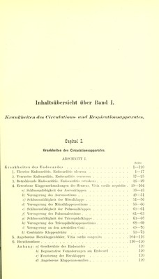 ![Iiilialtsübersiclit über ßaiid 1. Ki (t)i/k/teiteu des OircHlation.s- uikJ Besph ationsappavates. Capitel I. Krankheiten des Circulationsapparates. ABSCHNITT I. Seite Krankli eiten des Endocardes 1—120 1. Ulceröse Endocarditis. Endocarditis ulcerosa 1—17 2. Verrucöse Endocarditis. Endocarditis verrucosa 17—25 3. Eetrahirende Endocarditis. Endocarditis retrahens 26—^29 4. Erworbene Klappenerkranlcungen des Herzens. Vitia cordis acriuisita . 29—104 a) ScMussunfäliigkeit der Aortenklappen 38—48 b) Verengerung des Aortenostiums 49 — 51 c) ScMussunfäliigkeit der Mitralklappe 51—56 d) Verengerung des Mitralklappenostiums 56—60 e) Schlussunfäliigkeit der Pulmonalklappen 60—61 ./') Verengerung des Pulmonalostiums 61—63 //) Schlussunfäliigkeit der Tricuspidalklappe 63—68 h) Verengerung des Tricuspidalklappenostiums 68—69 i) Verengerung an den arteriellen Coni 69—70 k) Combinirte Klappenfeliler 70—73 5. Angeborene Herzklappenfeliler. Vitia cordis congenita 104—116 6. Herzthrombose 116—120 Anhang: a) Geschwülste des Endocardes 120 h) Degenerative Veränderungen am Endocard 120 c) Fensterung der Herzkla])pen .... 120 d) Angeborene Klappenanomalieu 120](https://iiif.wellcomecollection.org/image/b20416015_001_0011.jp2/full/800%2C/0/default.jpg)
