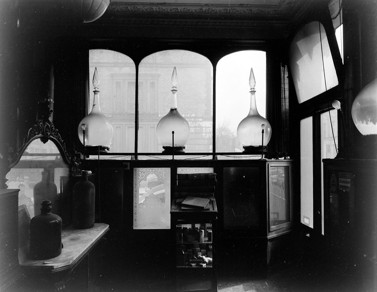 M0019044: Interior of N. F. Tyler Dispensing Chemist at 87 Abingdon Road, London showing the front window and carboys in position. In copyright. Source: Wellcome Collection.