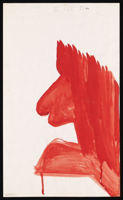 Credit: Red vertical lines intersected with zigzag lines, and a red rounded and angular shape, possibly a face in profile. Source: Wellcome Collection.