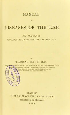 Manual of diseases of the ear : for the use of students and practitioners of medicine / by Thomas Barr.