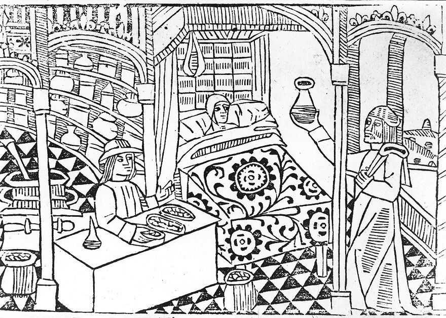 Credit: M0013715: Apothecary, patient and physician, 14th century. Source: Wellcome Collection.