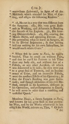 Credit: The history of ruptures, and rupture-curers, etc ... Occasion'd by a letter from a physician at Paris, to a physician at London, concerning a new and never-failing way of curing all sorts of ruptures ... by an infallible remedy, a secret. With a genuine receipt of the whole secret ... as also of a famous stiptick ... / By R[obert] H[ouston], M.D., F.R.S. Source: Wellcome Collection.