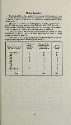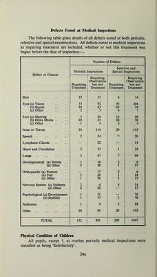 ![Defects Found at Medical Inspections The following table gives details of all defects noted at both periodic, selective and special examinations. All defects noted at medical inspections as requiring treatment are included, whether or not this treatment was begun before the date of inspection:— Defect or Disease Number of Defects Periodic Inspections Selec Special ] ive and nspections Requiring Treatment Requiring Observation but not Treatment Requiring Treatment Requiring Observation but not Treatment Skin 12 37 6 34 Eyes (a) Vision 33 92 93 404 (b) Squint 34 43 13 34 (c) Other .. 2 5 4 7 Ears (a) Hearing 3 24 13 48 (b) Otitis Media .. 10 43 24 36 (c) Other .. 1 3 2 3 Nose or Throat 18 114 29 112 Speech 5 54 7 30 Lymphatic Glands H 22 — 14 Heart and Circulation 2 23 1 18 Lungs 5 47 7 68 Developmental (a) Hernia .. 1 16 2 ’ 6 (b) Other .. 3 58 1 37 Orthopaedic (a) Posture — 17 2 6 (b) Feet 5 29 1 18 (c) Other 1 26 3 23 Nervous System (a) Epilepsy 2 4 4 14 (b) Other .. 2 22 — 13 Psychological (a) Development 1 51 — 76 (b) Stability 1 57 3 76 Abdomen 1 9 5 18 Other 10 95 28 152 TOTAL 152 891 248 1247 Physical Condition of Children All pupils, except 5, at routine periodic medical inspections were classified as being ‘Satisfactory’. 24a](https://iiif.wellcomecollection.org/image/b29536832_0048.jp2/full/800%2C/0/default.jpg)