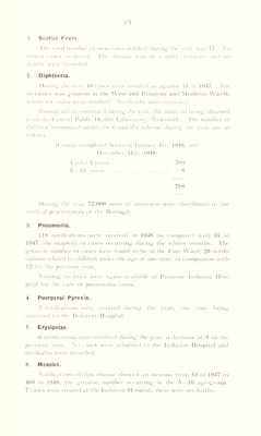 ![1 Scarlet Fever. I lie total number ol new raso notified during the vear was 17. \o return eases oeeurred. I he disease was ol a mild eharaeler and no deaths were reeorded. 2. Diphtheria. Ilurino the vear 10 eases were notified as against 11 in 1947. I he incidence was greatest in the West and Primrose and Monkton Wards, where six cases were notified. \o deaths were recorded. Immunisation continued during the vear, the material being obtained horn the Central Public Health Laboratory, Newcastle. I lie number ol children immunised under the Council's scheme during the year are as 11illows : (Course completed between Januarv 1st, 1948, and I )ecember His], | 94S. I'nder 5 years 760 5—lr» years S 768 During the year 72,000 units ol antitoxin were distributed to the medical practitioners ot the Borough. 3. Pneumonia. 119 notifications were received in 1948 as compared with 55 in 1947, the majority ol cases occurring during the winter months. The greatest number ol cases were lound to be in the Last Ward. 28 notifi- cations related to children under the age ol one vear, in comparison with 12 for the previous year. Nursing lacilitics wen again available at Primrose Isolation Hos- pital lor the care ol pneumonia eases. 4 Puerperal Pyrexia. 3 notifications were received during the vear, one case being admitted to the Isolation Hospital. 5 Erysipelas. 8 notifications were received during the year, a decrease of 3 on the previous year. No cases were admitted to the Isolation Hospital and no deaths were recorded. 6. Measles. Notifications ol this disease showed an increase (rom 53 in 1947 to 408 in 1948, the greatest number occurring in the 5 10 age-group.](https://iiif.wellcomecollection.org/image/b29499884_0037.jp2/full/800%2C/0/default.jpg)