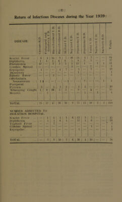 ![(^3) Return of Infectious EMseases during the Year 1939: DISEASE. Cemaes R.D. Fishguard and Goodwick U.D. Haverfordwest U.D. Haverfordwest R.D. Milford U.D. j Neyland U.D. j Pembroke U.D. 1 Pembroke R.D. 1 Tenby U.D. j Narberth U.D. j Narberth R.D. | j Totals. Scarlet Fever ... 6 1 1 14 0 1 Ifi 24 3 - — 84 Diphtheria ... | 1 1 1 1 1 1 ^ 1, 6 0 8 1 0 rv 5 — 37 Pneumonia 12 - 1 2 1 3 1 5 1 1 lo 1 1 — 1 1 41 Cerebro Spinal | - 1 - 1 — - 1 - - 1 2 — — 3 19 Erysipelas 1 -'l - 7 - - — — Dysentery - 1 Enteric FON’er ... - 6 Ofihthahnia Neonatorum ...- 1 1 M- 1 - 1 - -« -1 2 1 1 1 4 Puerperal Pyrexia 1 1 ^ 1 1 - 1 1 2 — — - 10 Wliooiiing Cough] 1, 1 8 1 .2a 1 3 1 3 - *•> 1 - - Measles 1 '-il 1 1 - - 1 1 - 4 TOTAI. 1 2:-. 12 47 2f. 30 V.'i 13 18 2 2 1 2r)9 NUMiBEH .ADMITTED ISOf.ATION HOSPITAI Scarlet Fever ... j — ro 1 4 4 1 f, 23 3 3 4.7 Diphtheria 1 — 1 1 6 1 — 12 1 6 — — 28 Typhoid Fever 3 ' 3 Cerebro Spinal • 1 — — — — — — . 1 — — 1 Erysipelas 1 1](https://iiif.wellcomecollection.org/image/b28870396_0025.jp2/full/800%2C/0/default.jpg)
