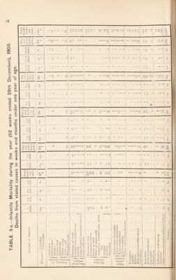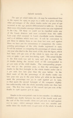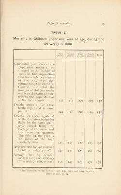 ![TABLE 5° Mortality in Children under one year of age, during the 52 weeks of 1906a First Quarter. Second Quarter. Third Quarter. Fourth Quarter. Year. Calculated per 1,000 of the population under 1, es¬ timated to the middle of 1906, on the supposition that the whole population of the city was that estimated by the Registrar Genera], and that the number of children under one bore the same propor¬ tion to the population as at the 1901 census I48 I 15 222 I23 152 Deaths under 1 per 1,000 births registered in same period 144 I l6 216 129 152 Deaths per 1,000 registered births, the latter instead of those for the same quar¬ terly period being the average of the same and four preceding quarters. The rate for the year is the mean of the four quarterly rates ... 145 115 222 125 152 Average rate by last method for five preceding years* 141 131 223 161 164 Average rate by second method for years 1886-90 (from table 7a 1890 report) HH OT CO 14 7 223 171 175 * See correction of this line for table 5 in 1905 and 1904 Reports, given in text, p. 14.](https://iiif.wellcomecollection.org/image/b2972241x_0019.jp2/full/800%2C/0/default.jpg)