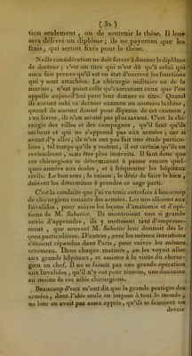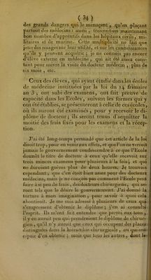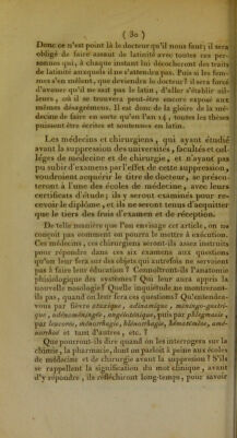 ![des grands dangers qui le menaçant ^,,,q^’en plaçant partout des médecins : aussi , trouve-t^n maintenant bon nombre d’apprcntifs dans les htiplVaux ciyils, nii- litaires et de marine. Cette mnltipliclté ne f^t que jeterdes nuages sur leurutilité, et sur les ponnôiss^ces qu’ils y peuvent acquérir j je ne connois pas encore d’élève externe en médecine j qui ait été assez cons-^ tant pour suivre la visite du docteur médecin , plus de six mois , etc. , ^ Ceux des élèves, qui ayant étudié dans les écoles de médecine instituées par la loi du 14 frimaire an 3, ont subi des examens, ont fait preuve de capacité dans les Ecoles , suivant les formes qui y oui étéétablies, se présenteront à celle de ces écoles, où ils auront été examinés , pour y recevoir le di- plôme (le docteur ; ils seront tenus d’acquitter la nnjliié des frais fixés pour les examens et la récep- tion. ■ ' J’ai été long-temps persuadé que cet article de la loi disoit trop, jiour en veniraux effets, et quol’on neverroit jamais le gouvernement condescendre à ce que l’Ecole domidt le titre de docteur à ceux qu’elle l'ecevoit sur trois minces examens pour plusieurs à la fois, et qui ne dnroient guères plus de deux heures. Je trouvois cependant, que c’en étoit bien assez pour des docteurs médecins, mais je ne conçois pas comment l’Ecole peut faire à si peu de frais , des docteurs chirurgiens, qui se- ront tels que le désire le gouvernement. J’ai donné la torture ù mon imagination,- pour savon à quoi cela aboutiroit. Je me suis adressé à plusieurs de ceux qui s’enqpressent d’obtenir le diplôme ; j’en ai consulté : l’esprit. Ils m’ont fait entendre que parmi eux tous , il y en aurolt peu qui prendrolent le diplôme de chirur- gien , <pi’il n’y auroit que ceux <]ui occupent des places» distinguées dans la hiérarchie chirurgicale , ou quiontt espoir d’en obtenir : mais que tous les autres , dont 1» :](https://iiif.wellcomecollection.org/image/b22446308_0044.jp2/full/800%2C/0/default.jpg)