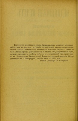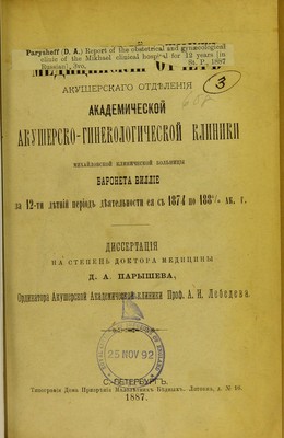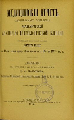 Meditsinskii otchet akusherskago otdieleniia akademicheskoi akushersko-ginekologicheskoi kliniki Mikhailovskoi Klinicheskoi Bol'nitsy Baroneta Villie za 12-ti lietnii period dieiatel'nosti eia s 1874 po 1885/6 ak. g. : dissertatsiia na stepen' doktora meditsiny / D.A. Parysheva.