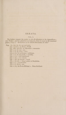 ![ERRATA. VOL. I. The Author requests the reader to dele all references to the Appendixes— vide Preface ; and for ogliarch to read oligarch, where it occurs in the translated papers, Chap. I. “ Reflections on the Danish Revolution of 1660.” Page 25—line 16, for our read your. 104—last line, for Woff r. Wolff. 107, 108, and 131, for Messenin r. mezzanine. 109—1. 4, for eat r. ate. £12-1 9. for 1776 97, 1774. 116—1.13, for noblemen r. nobleman. 117—1. 3, for physically r. mentally. 118—1. 12, r. and abandoned. 125—1. 16, r. two o'clock. 130—1. 20, for second r. sword. 192—l. 3, note. r king’s palace at Stockholm. 222—1.7, r sat absorbed. 303—1. 1, for is r. are. 340—]. 21, for O-stre-Gotland r, Ostra Gothland.](https://iiif.wellcomecollection.org/image/b33282699_0001_0025.jp2/full/800%2C/0/default.jpg)