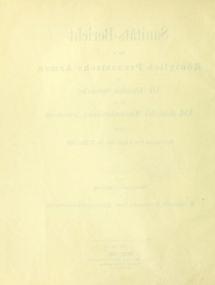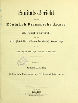 Sanitäts-Bericht über die Königlich Preussische Armee, das XII. (Königlich Sächsische) und das XIII. (Königlich Württembergische) Armeekorps fur die Berichtsjahre vom 1. April 1884 bis 31. Marz 1888 / bearbeitet von der Medizinal-Abtheilung des Königlich Preussischen Kriegsministeriums ...