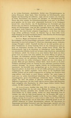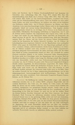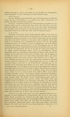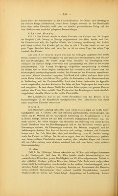 ![ähnlichen Flüssigkeit;' auch im Pericardium ein paar Esslöffel voll blutiggefärbter seröser Flüssigkeit, wie auch stellenweise ein feiner fibrinöser Belag. 6. B e r n h e i m. Bei einer 22]ährigen Cigarrenarbeiterin waren die Erscheinungen einer Pleuritis dextra und einer Abscessbildung in der rechten Fossa iliaca nacheinander auf- getreten. Tod nach 4wöchentlicher Krankheit. Section: Ausgedehnte Eiterung der Bauchwandungen ausserhalb des Peri- toneums, welche von der rechten Fossa iliaca hinter die rechte Niere und Leber gieng und schliesslich in die rechte Niere und in die rechte Lunge durchgebrochen war. Im Referat wird nicht gesagt, ob eine Perforation des Cöcums oder des Proc. vermiformis nachgewiesen wurde oder woher sonst die Eiterung stammte. 7. K. Jaffe. Ein Mann von 30 Jahren wurde am 21. September 1880 zu Curschmann aufgenommen. Er ist 3 Wochen früher an Leibschmerz in der rechten Seite erkrankt und plötzlich bettlägerig geworden. In den letzten 8 Tagen hatte sich eine langsam wachsende, schmerzhafte Geschwulst in der rechten Seite ausgebildet. Am 23. Sept. wurde er zur Eröffnung eines perityphlitischen Abscesses auf die chirurgische Abtheilung transferirt. Der Kranke war blass, herabgekommen, mit leicht erhöhter Temperatur und kleinem, frequentem Puls. In der Ileocöcalgegend war die Haut geröthet und gespannt. Der Fingereindruck blieb stehen. Das Hautödem setzte sich nach oben fast bis zum Rippenrande hin fort. In der Tiefe der rechten Seite fühlte man eine teigige, schwach fluctuirende Stelle, welche als perityphlitischer Abscess diagnosticirt wurde. Die physikalische Untersuchung des Thorax ergab normale Ver- hältnisse auf der linken Seite. Rechts fand sich hinten unten eine Dämpfung bis zur Mitte der Scapula, und an der oberen Grenze bronchiales Athmen und mittel- grossblasiges Rasseln. Vorn rechts ein lauter, voller Schall bis zur 5. Rippe, von da ab gedämpft tympanitischer Schall. Bei percutorischer Auscultation entstanden deutliche metallische Phänomene der Athmungsgeräusche; bis zur 5. Rippe rein vesiculäres Athmen, schnitt hier ab, um im Bereiche der Dämpfung ganz zu ver- schwinden. In der Seitenwand gieng letzteres bis zur 6. Rippe; auch hier fehlte das Athmungsgeräusch von der 7. Rippe ab. Zeitweise hörte man amphorisches Hauchen. Dislocation des Herzens wurde nicht beobachtet. Diagnose: Pleura-Empyem, entstanden durch Perforation des Bauchabscesses in die Brusthöhle. Zuerst wurde der Bauch- abscess durch eine 12 cm lange Incision breit eröffnet, 1000 g einer fäculent riechenden Flüssigkeit entleert, nebst grossen Mengen nekrotischer Gewebsfetzen. Der Schnitt führte in eine grosse, augenscheinlich extraperitoneale, bis zum Leber- rande reichende Höhle. Ein Einfluss auf das Thoraxempyem konnte durch die Entleerung des Bauchempyems nicht constatirt werden. Die Wunde wurde dann ausgiebig drainirt und Patient in ein permanentes Wasserbad (5 leg Natrium sub- sulphurosum auf ein Vollbad) gesetzt. Die Eröffnung des Leberabscesses geschah erst 2 Tage später und wurde in der Weise ausgeführt, dass eine breite Incision im 7. Intercostalraum in der Axillarlinie gemacht wurde, wodurch wieder fast ein Liter putriden Eiters entleert wurde. Drainage, permanentes Wasserbad. Die Bauch- wunde schickte sich an zur Reinigung, doch verfiel der Kräftezustand des Patienten immer mehr und mehr und er starb 9 Tage nach der Operation. Die Section ergab einen lateral vom Cöcum gelegenen Kothabscess, aus- gegangen von einer Perforation des Wurmfortsatzes, der in toto in einen nekro- tischen Strang verwandelt war. Oberhalb der Leber findet sich eine mit dem Kothabscess nicht communicirende, fast kindskopfgrosse Höhle, theilweise mit stin- kender Jauche gefüllt. Diese Höhle war nach oben vom Zwerchfell, nach links vom Ligamentum Suspensorium hepatis, nach unten vom rechten Leberlappen begrenzt. Sie reicht nach oben bis zum oberen Rande der 4. Rippe hin. In sie M a y d ], Über subphrenische Abscesse. 10](https://iiif.wellcomecollection.org/image/b21066693_0163.jp2/full/800%2C/0/default.jpg)